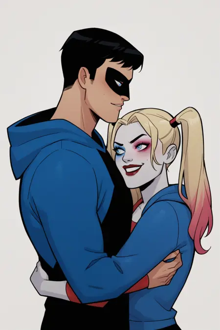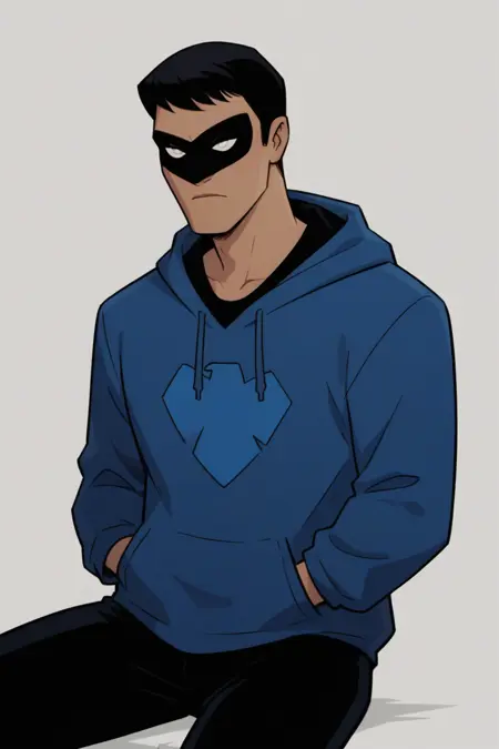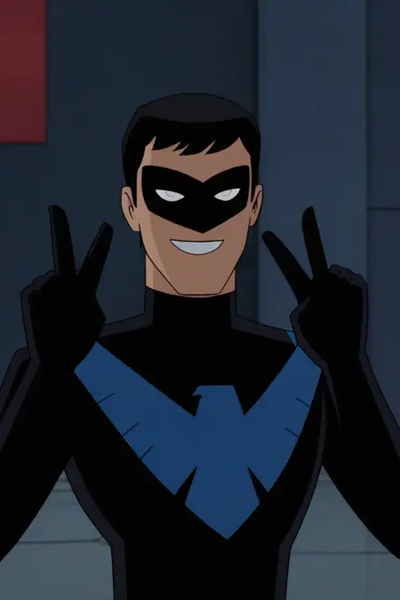 你好,我最新的夜翼LoRA出自《蝙蝠侠与哈莉·奎茵》,其设计非常接近《新蝙蝠侠冒险》的风格,不过也有一些细微的改动。