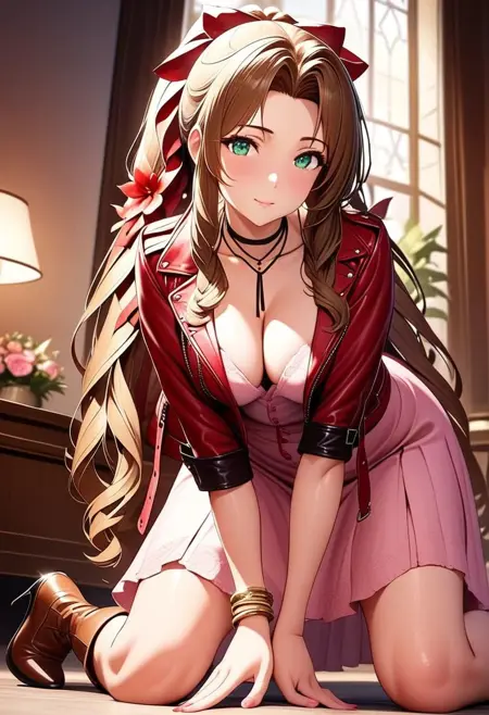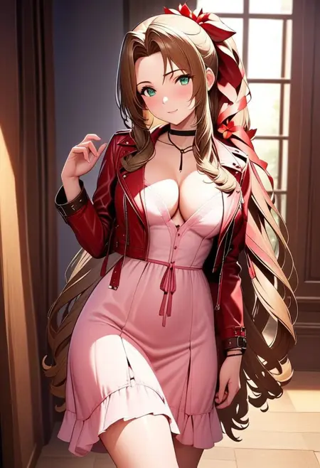 触发词:aerith_a_xl,长发,发带,发饰,项圈,短款深红色夹克,手镯,粉色连衣裙,无肩带粉色连衣裙,棕色靴子,高跟鞋,
