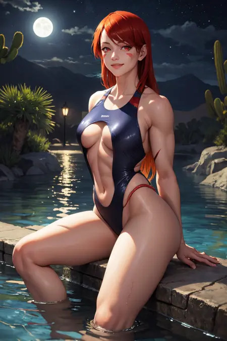 Main outfit: "muscular, abs, halterneck, leather pants, underboob, underboob cutout".