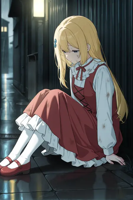 Outfit: b0se0utf1t,red dress,white sleeves,frills,neck ribbon,white legwear,red shoes,mary janes,