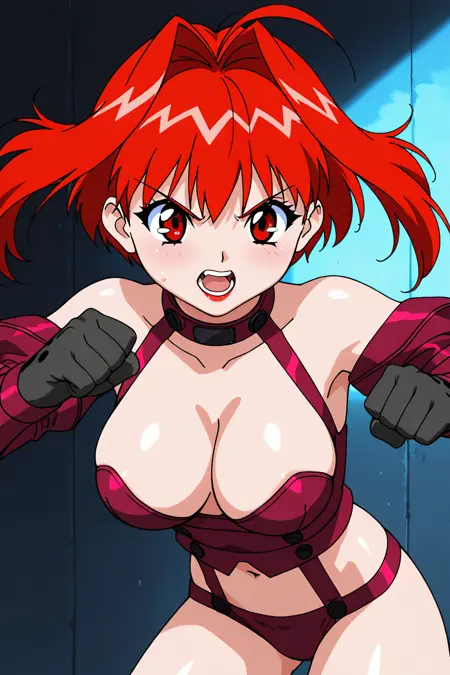 viper-m1-mikasuit,red eyes,tsurime,red hair,short hair,bangs,hair intakes,ahoge,