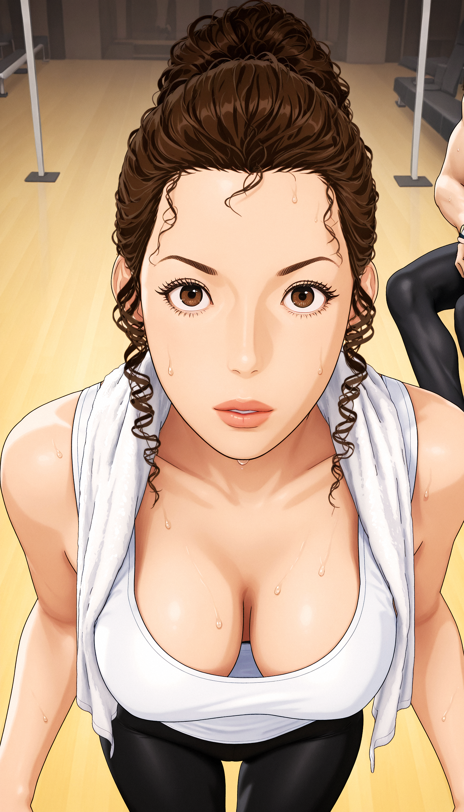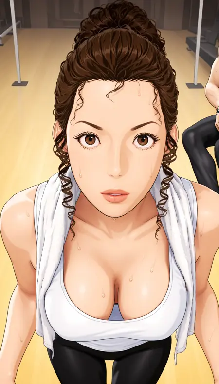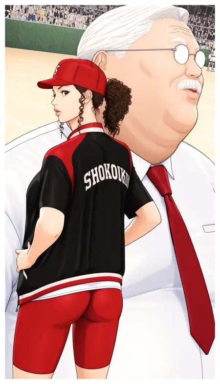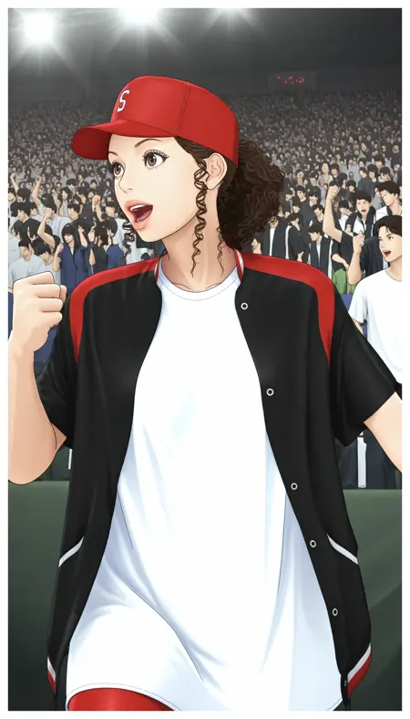 メイン衣装:Ayako、1girl、ポニーテールの茶色のカールヘア、茶色の目、厚い唇、長いまつげ、Ayako_red baseball cap、Ayako_white T-shirt、Ayako_black and red short-sleeve jacket、Ayako_red bike shorts、Ayako_white sneakers、