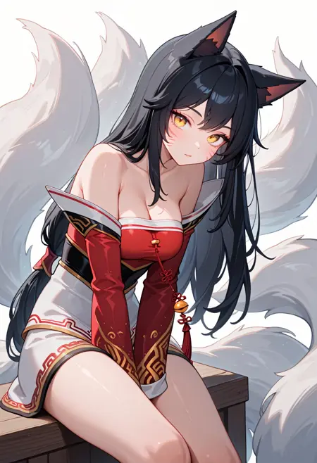 ahri \(league of legends\) , black hair, long hair, fox ears, yellow eyes, korean clothes, long sleeves, detached sleeves, bare shoulders, whisker markings