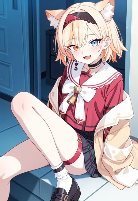animal ears, blonde hair, hairband, blue eyes, orange eyes, heterochromia, animal ear fluff, fang, choker, red shirt, jacket, skirt, socks, black footwear, thigh strap
