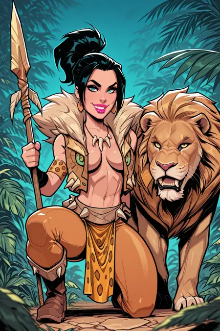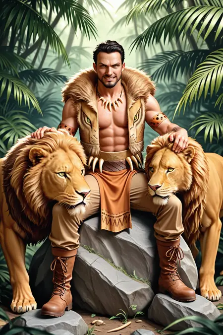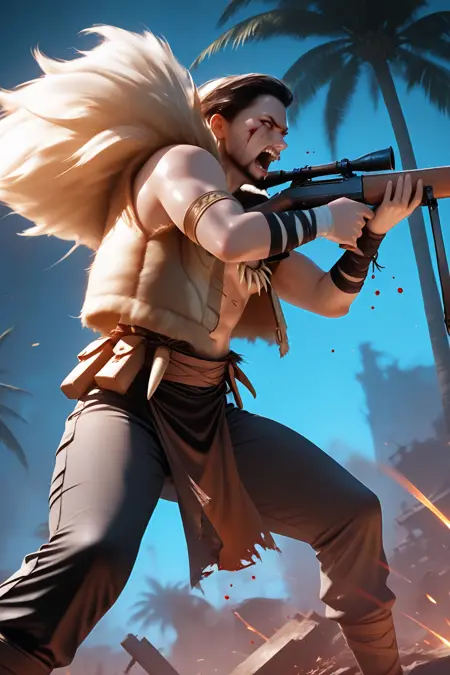 触发词:kravn,胡须,短发,毛皮镶边,背心,牙齿项链,腰带,尖刺,绷带,臂环,胯部帘布,长裤,靴子
