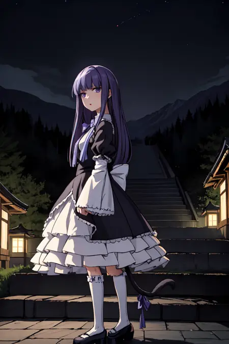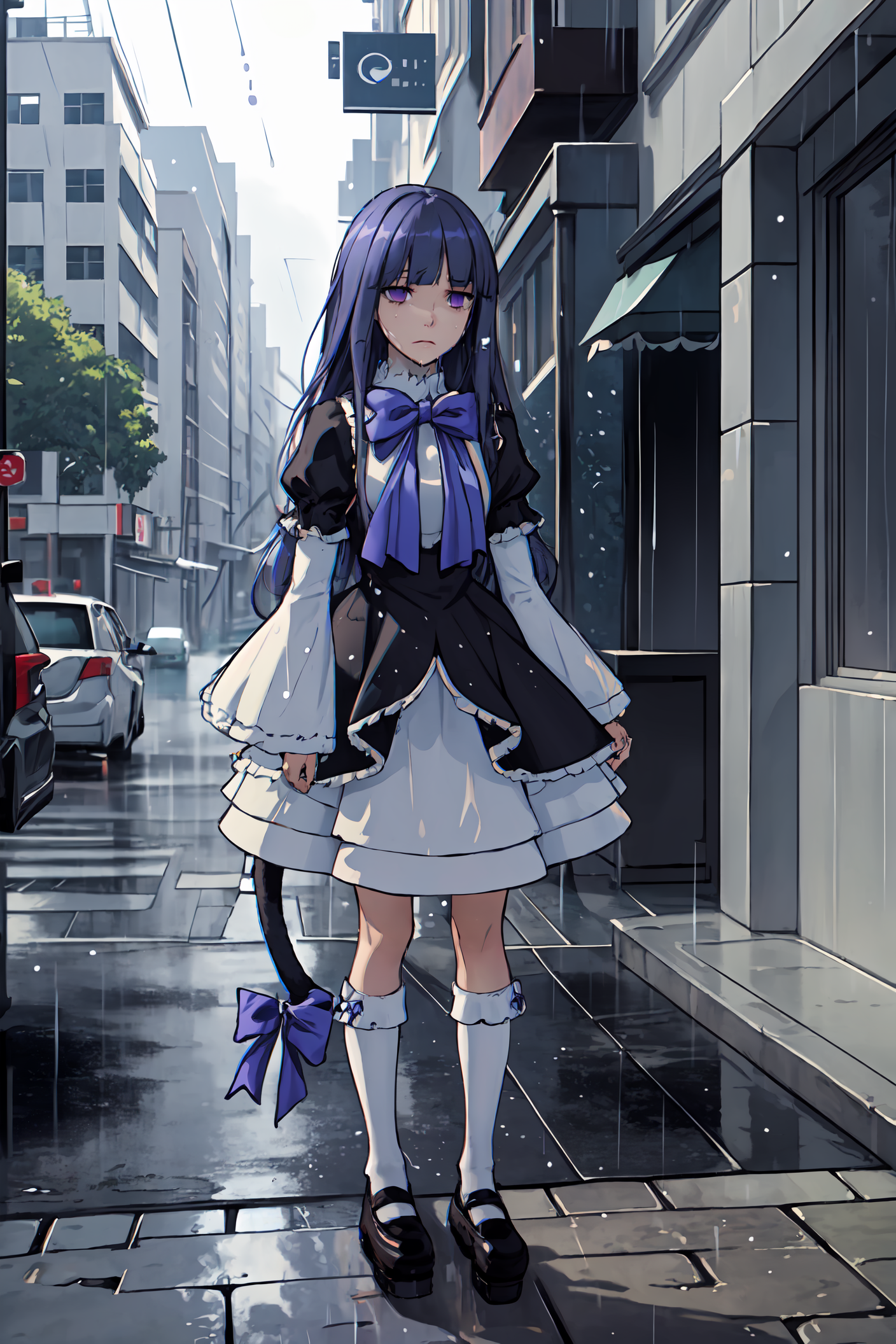 Major prompt words: purple hair, cat tail, tail bow