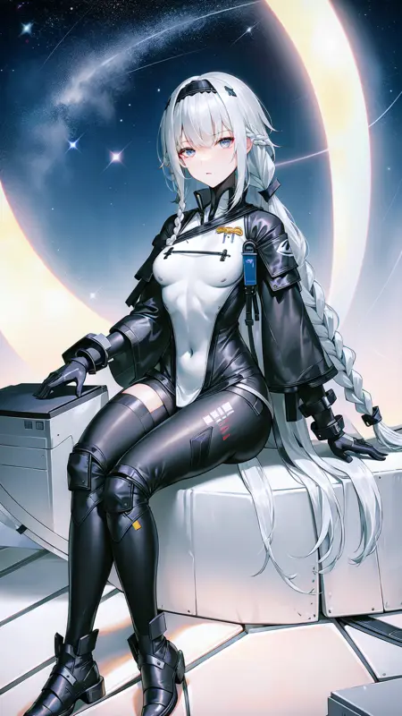 1girl, solo, long hair, grey eyes, breasts, hairband, black gloves, full body, black shoes, boots, white hair, braid, bangs, covered navel, gloves, bodysuit, medium breasts, cowboy shot, black hairband, lora:ChenxingSnowbreakV1.0:0.7, chenxing, night sky, dark, stars, starry sky, milky way, lights, light particles, fairy,
