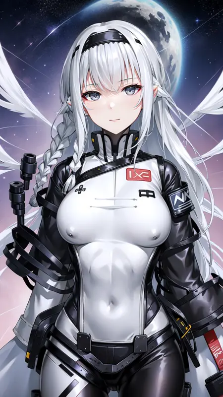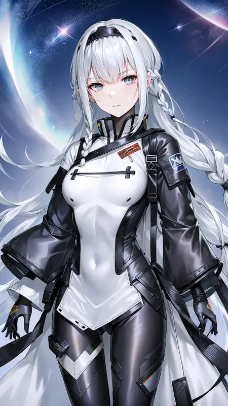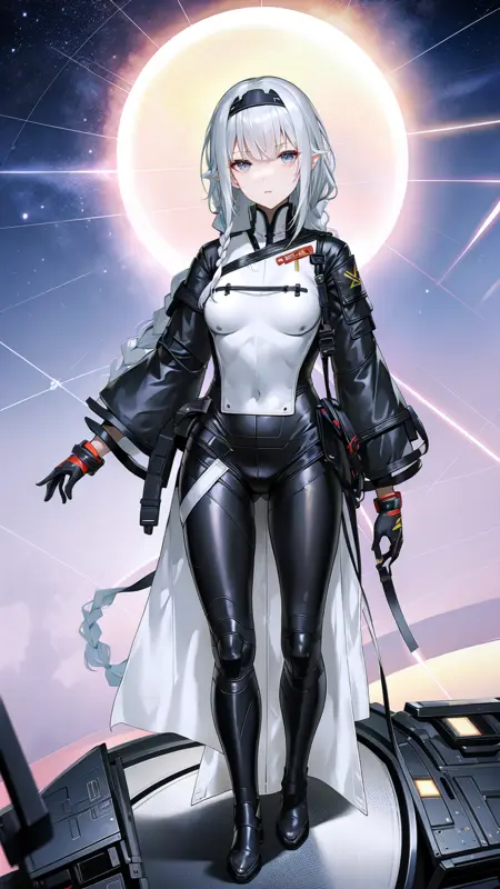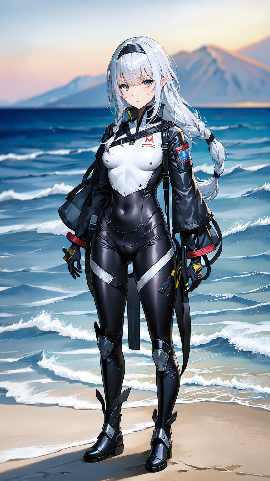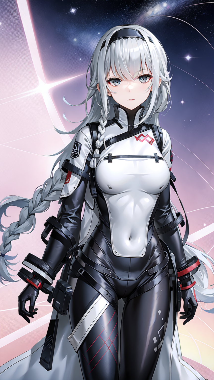 -->プロンプト:chenxing, bodysuit, covered navel, medium breasts, cowboy shot, black hairband, grey eyes,