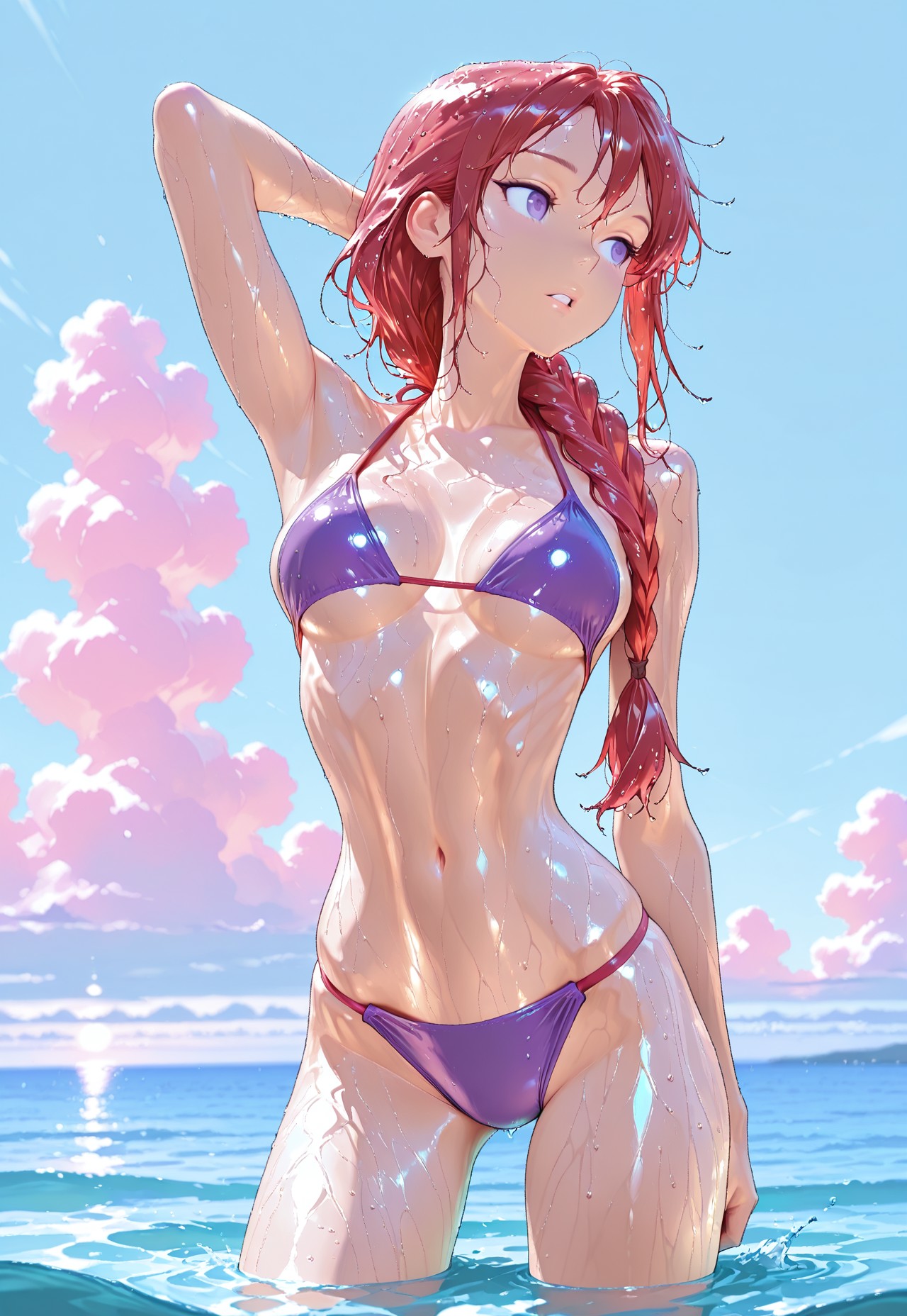 19歳の美少女、小柄な体格、スーパーモデル、白い肌、アルテミス、赤毛、長い編みこみ髪、顔にかかる1本の髪の毛、細部まで描かれた紫の目、ふっくらとした唇、完璧な鼻、細長い顔、スレンダーな体、自然な垂れ下がった胸、中程度の胸、中程度のお尻、丸いお尻、完璧な脚、