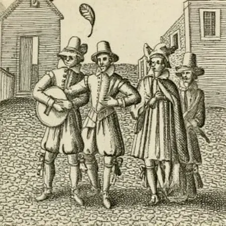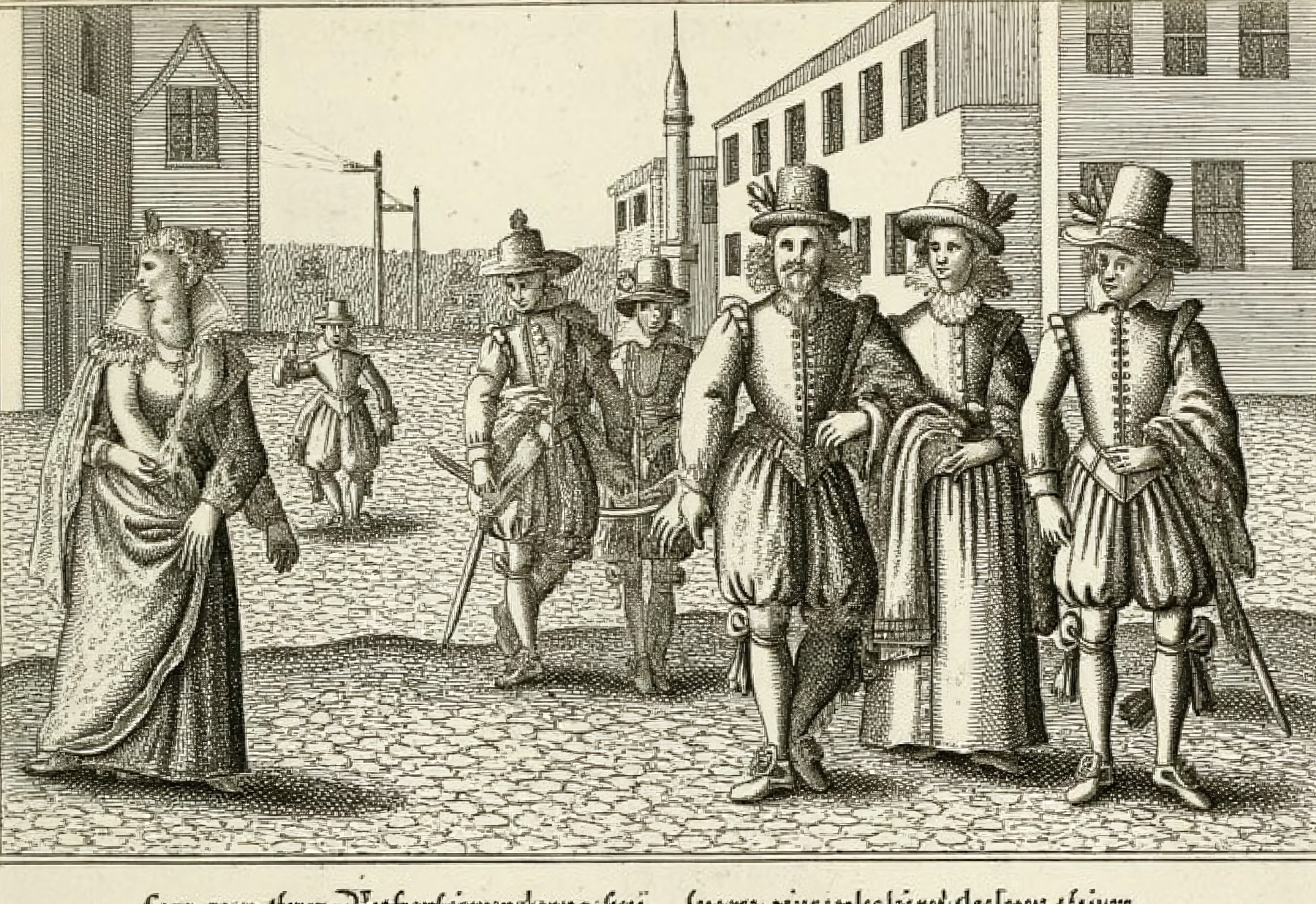 kjk style, , 图像为一幅古老版画,描绘了一群男子走在鹅卵石街道上。他们身着时代服饰,暗示场景发生在过去,可能为文艺复兴或早期现代时期。左侧一人正在弹奏鲁特琴,另一人手持一根顶端插有羽毛的权杖。其余人穿着不同款式的帽子和外套,显示出不同的社会阶层或身份。背景为砖墙建筑和数扇窗户,增强了场景的历史氛围。