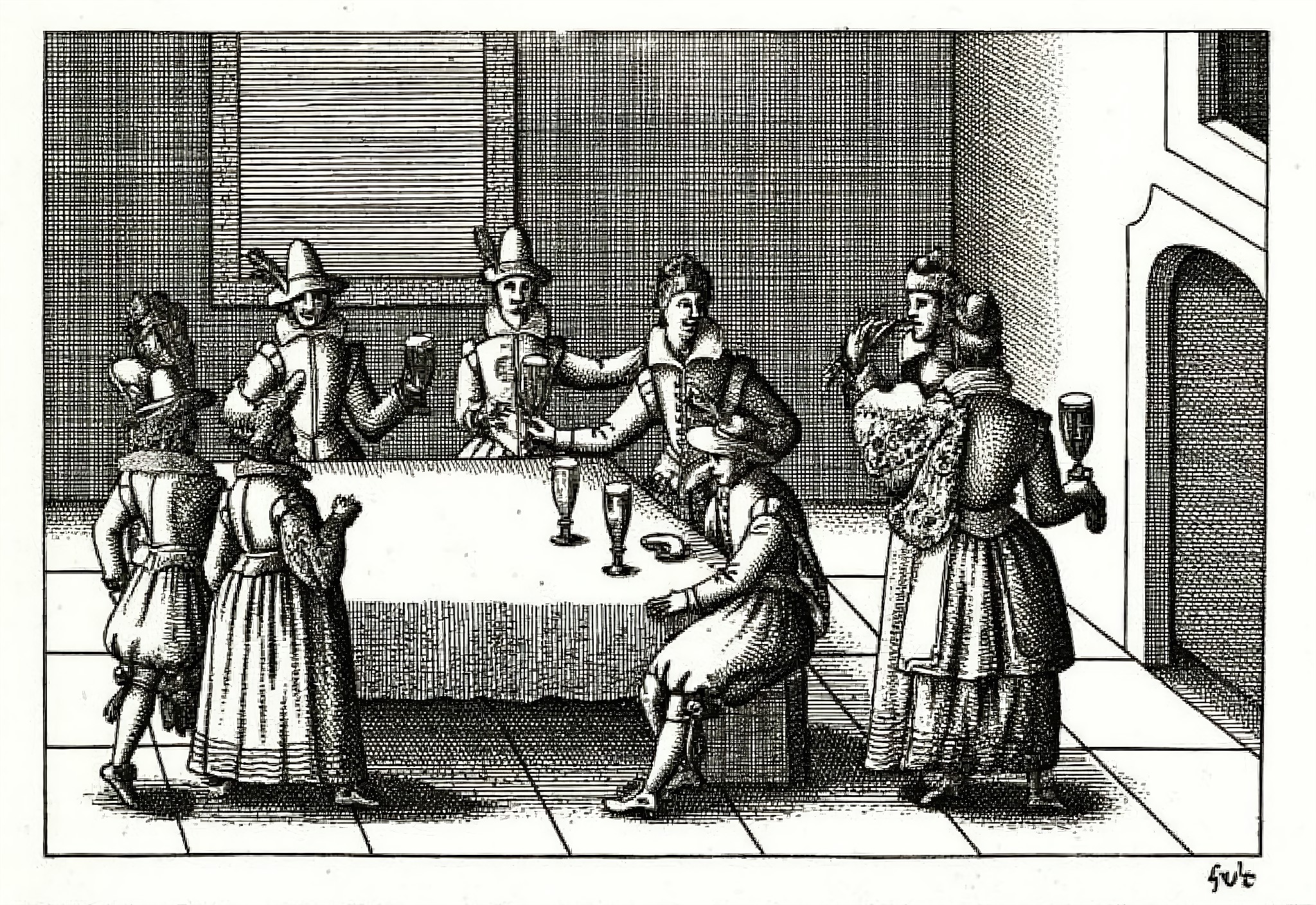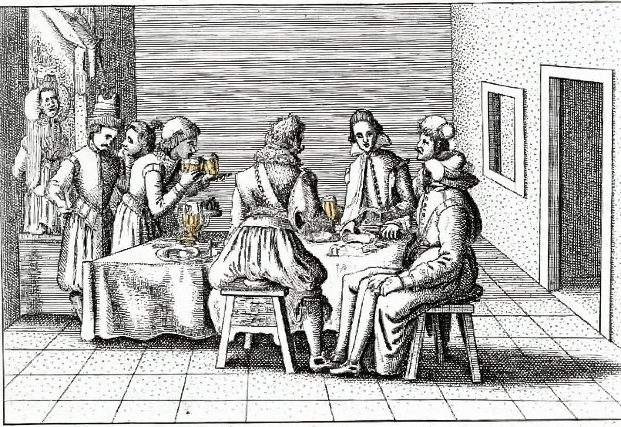 kjk style, , 图像为一幅老旧的黑白插画,描绘了一群人围坐在一张桌子旁,场景疑似中世纪或文艺复兴时期。房间内有窗户和门,暗示可能是私人居室或酒馆。人物身着时代服饰,包括帽子和长外套,体现历史背景。他们正在用餐,桌上摆放着盘子、餐具和酒杯。一人站立,高举盘子,似在分发食物,其他人坐着进餐。气氛热闹而融洽,其中一人正热情地比划着。