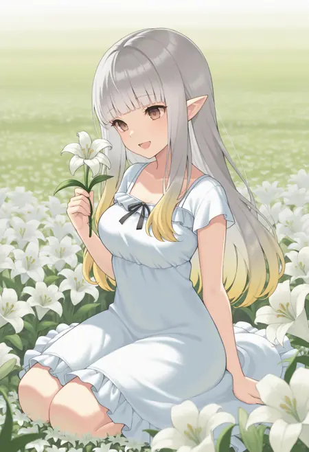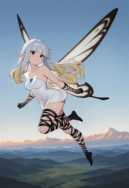 • Airy: airyBD、灰色の髪、長い髪、まっすぐな前髪、グラデーション髪、黄色の髪、茶色の目、とがった耳、白いドレス、短いドレス、ストラップレス、青い胸の宝石、フェアリーウィング、黒い手袋、フィッシュネット手袋、脚巻き、黒い脚衣、黒い靴下