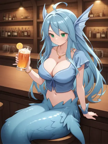 MerGenJessie, 연한 파란 머리, 긴 머리, 아호게, 녹색 눈, 머리 지느러미, 손목 지느러미, 손목 비늘, 지느러미, 인어, 몬스터 걸, 큰 가슴, 파란 셔츠, 젖가슴 노출, 허리 노출, 보석, 목걸이,