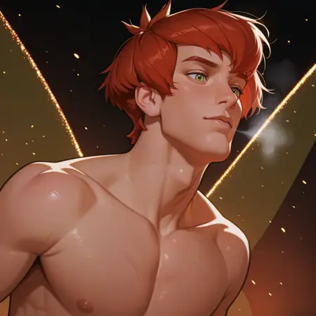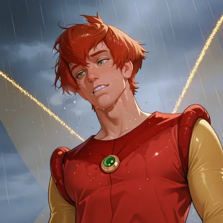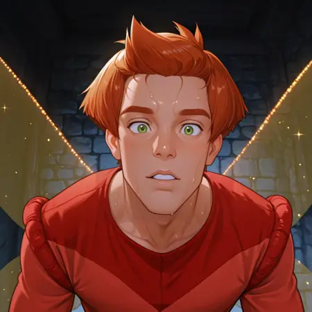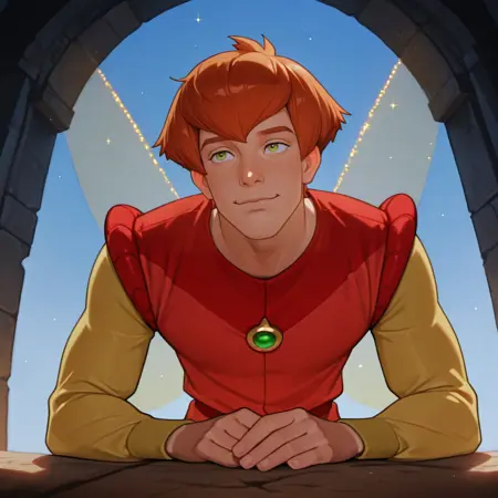 Prince_Cornelius,Prince_Cornelius_蓬松红发,Prince_Cornelius_绿色眼睛,Prince_Cornelius_精灵翅膀,中世纪奇幻服饰,Prince_Cornelius_橙红色衬衫,Prince_Cornelius_圆形胸针,Prince_Cornelius_金黄色长袖,Prince_Cornelius_腰带,系带武器枪套,Prince_Cornelius_紧身裤,Prince_Cornelius_中世纪靴子,Prince_Cornelius_银剑,闪亮翅膀,魔法尘埃