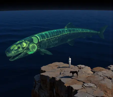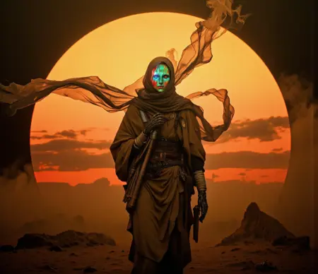 🌌 Otherworldly Creatures & Figures: Leviathan-like sky creatures, cybernetic sages, and ethereal guardians.