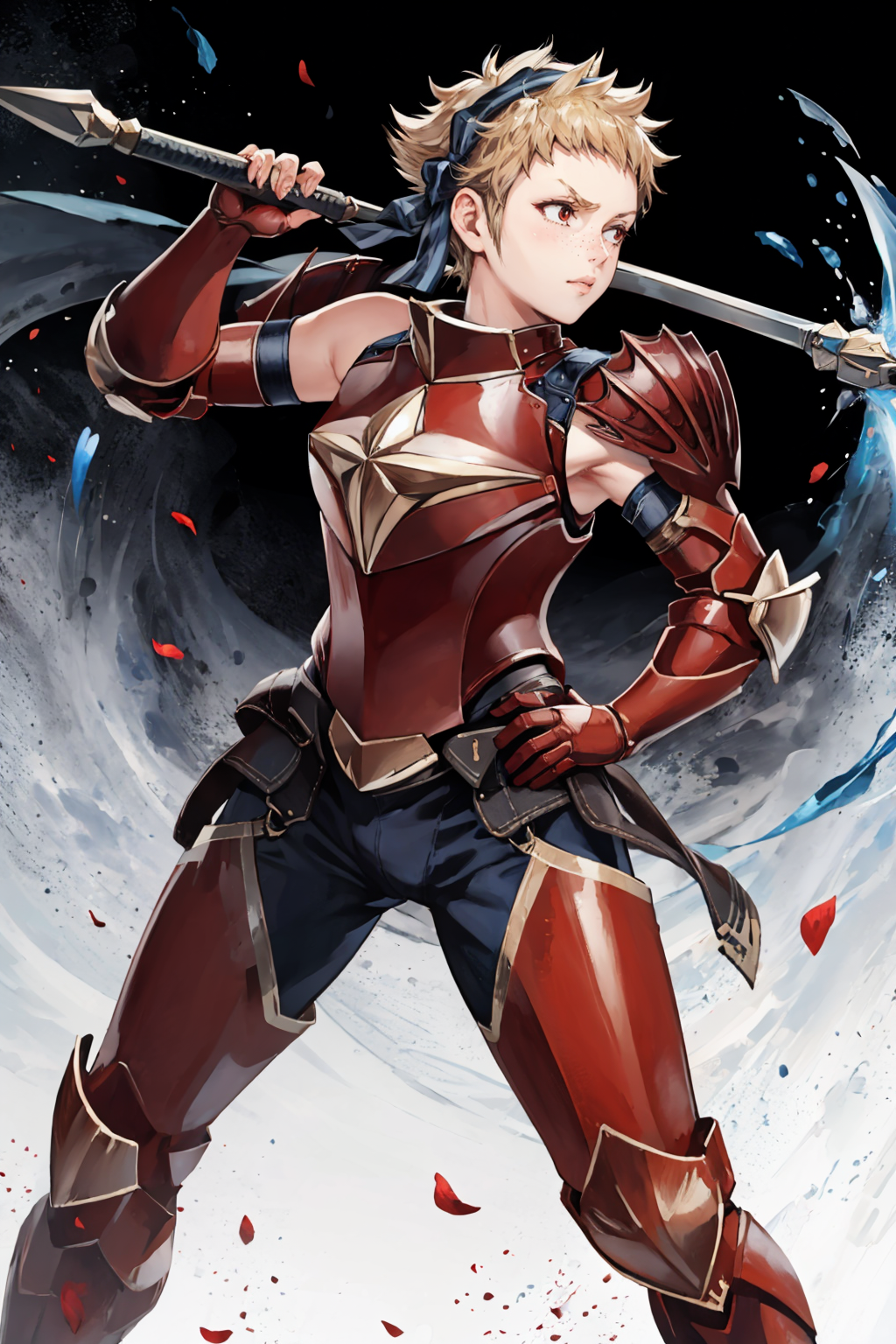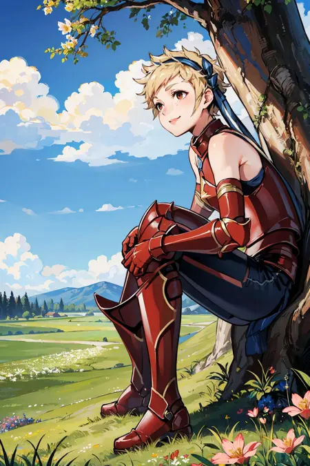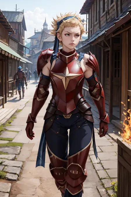 如需呈现她的典型造型,请添加 "发带、盔甲、装甲靴、裤子、护手"。