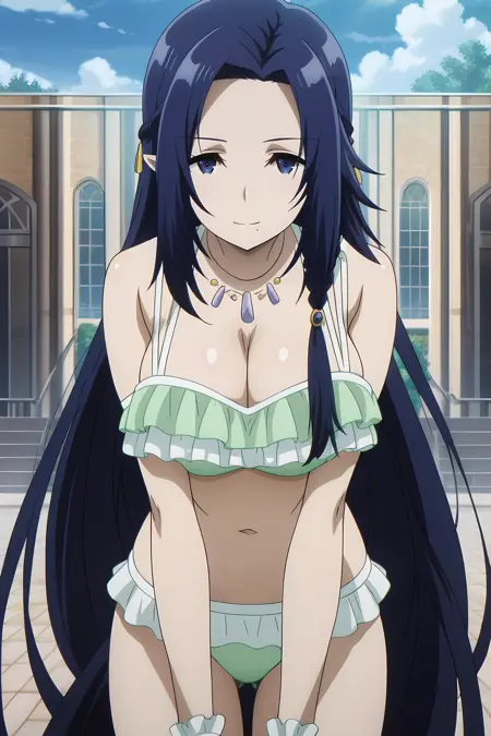 side braid, straw hat, cleavage, swimsuit, green bikini, jewelry, necklace, midriff, frills,