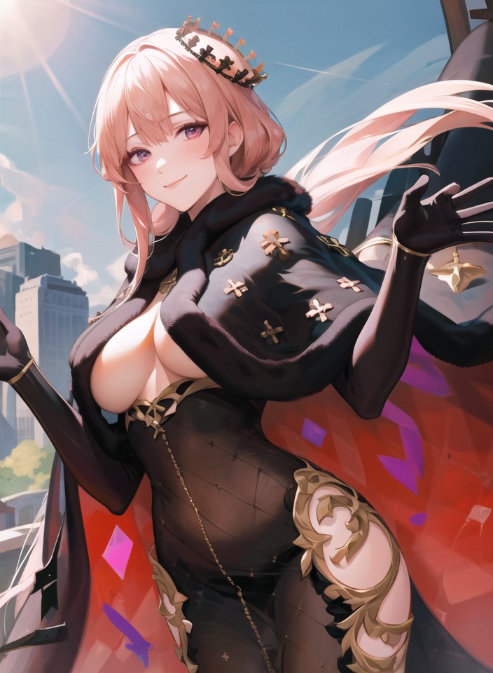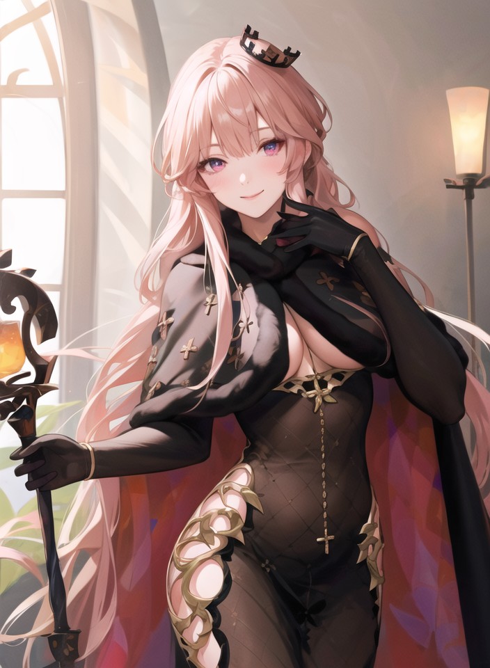 clemenceauDefault, black_cape, black_dress, black_gloves, cape, capelet,cleavage cutout,crown, elbow_gloves, hip_vent, large_breasts, long_dress, long_hair,two-sided_cape, fur-trimmed_capelet