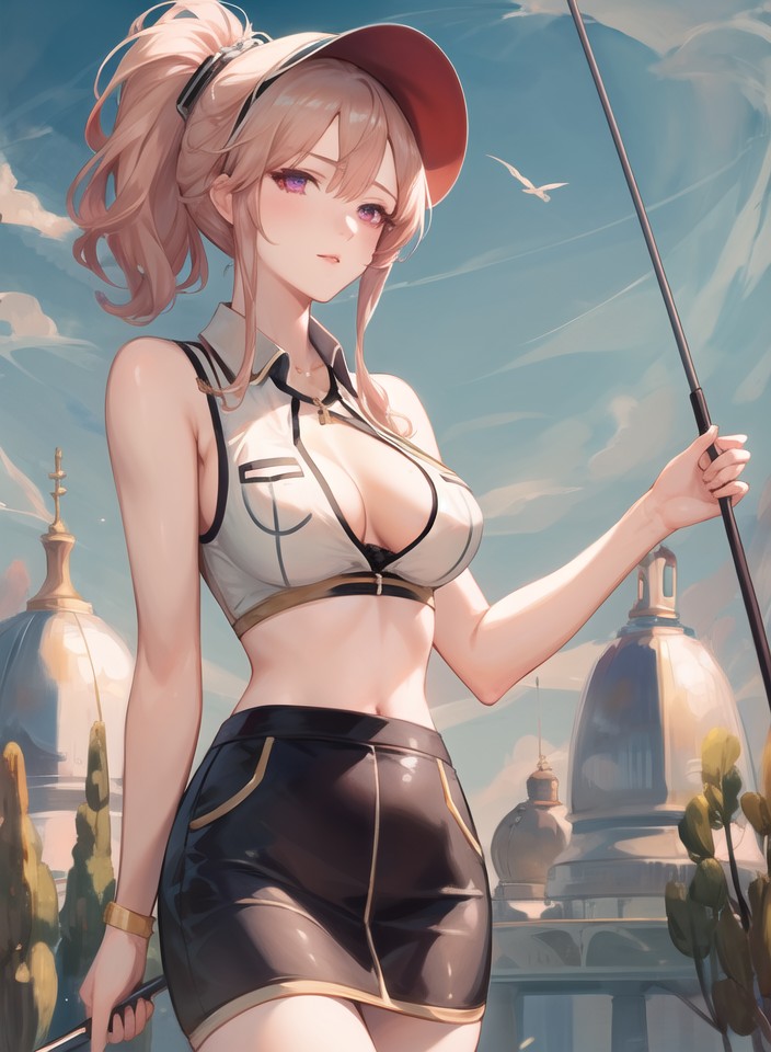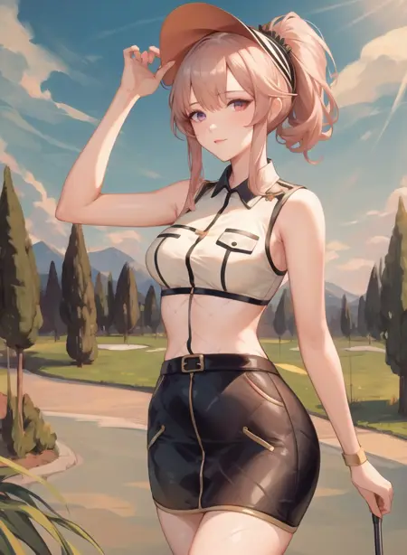 ClemenceauGolf, collared_shirt, pencil_skirt,miniskirt, ponytail, sleeveless_shirt,visor_cap, white_shirt, white_headwear