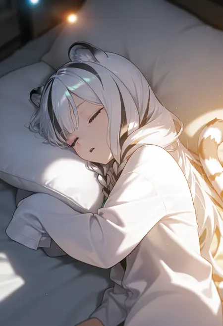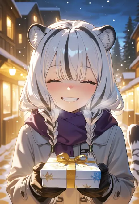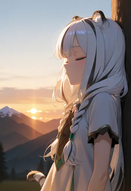 그녀의 외모 태그: 1girl, solo, long hair, black hair, animal ears, closed eyes, white hair, multicolored hair, twin braids, tiger ears, streaked hair, tiger girl, tiger tail,