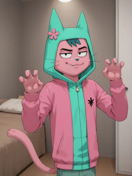 Miauricio, furry male, no humans, pink cat, pink fur, black eyes, green hair, short bangs, green nose, whiskers, prehensile tail, tail hand, mascot