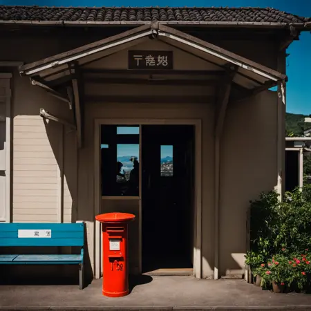 shimonadaeki, exterior, scenery, outdoors, power lines, sky, utility pole, road, building, cloud, street, day, blue sky, sign, tree, plant, Post box, realistic, photo (medium), photo background, real world location, train station