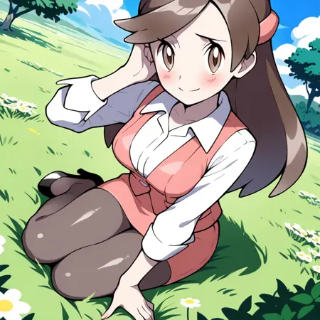 olbw, office worker \(pokemon\), office lady, brown eyes, long hair, brown hair, hair ornament, pink vest, white shirt, collared shirt, long sleeves, pink skirt, pencil skirt, black pantyhose, high heels, black footwear