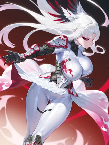 服装(全身):装甲发翼、白色紧身衣、贴身、遮住肚脐、装甲束腰、装甲裙、骨盆帘、白色甲片、白色裙摆、火焰纹裙、渐变裙、黑色裤子、宽松裤、裙下裤、装甲靴、白色靴子、护胫、肩甲、肘部手套、黑色手套、护手、锋利爪子、侧边开叉、渔网袜