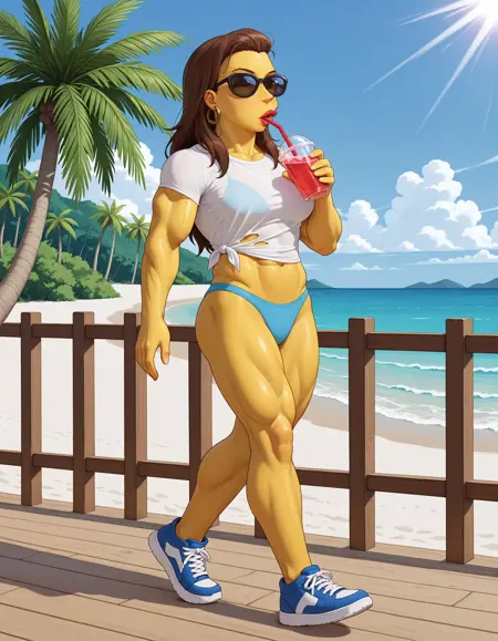 추가 요소 2: 1girl, solo, 노란 피부, 근육질의 여성, 갈색 머리, 긴 머리, 빨간 머리띠, 고리 귀걸이, 파란 비키니