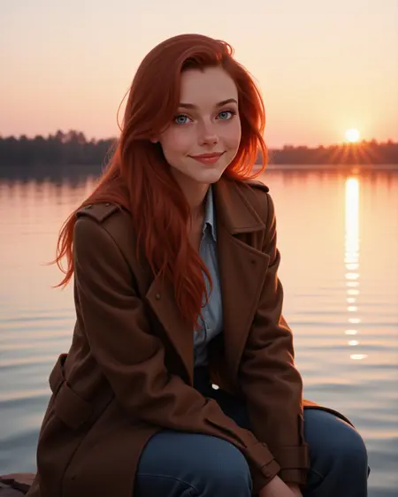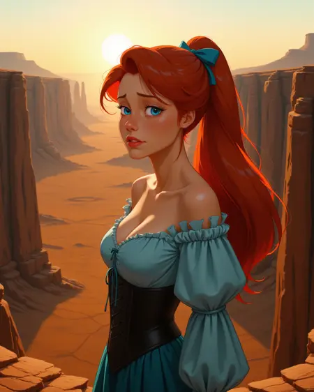 자유롭게 흐르는 빨간 머리카락을 가진 호기심 많은 젊은 여자로, 긴 연한 파란 드레스, 어두운 남색 코르셋 상의, 발목까지 내려오는 풍성한 치마, 흰색 긴 소매 안셔츠(부풀어 오른 손목)와 검은 구두를 입고 있습니다.