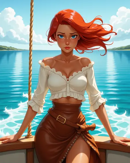 밝은 빨간 머리카락을 파란 리본으로 묶은 젊은 여자로, 하늘색 오프숄더 블라우스(통풍이 좋은 소매), 검은 코르셋 상의, 진한 파란색 플레어 스커트를 입고, 맨발입니다.