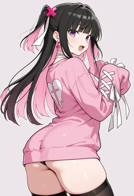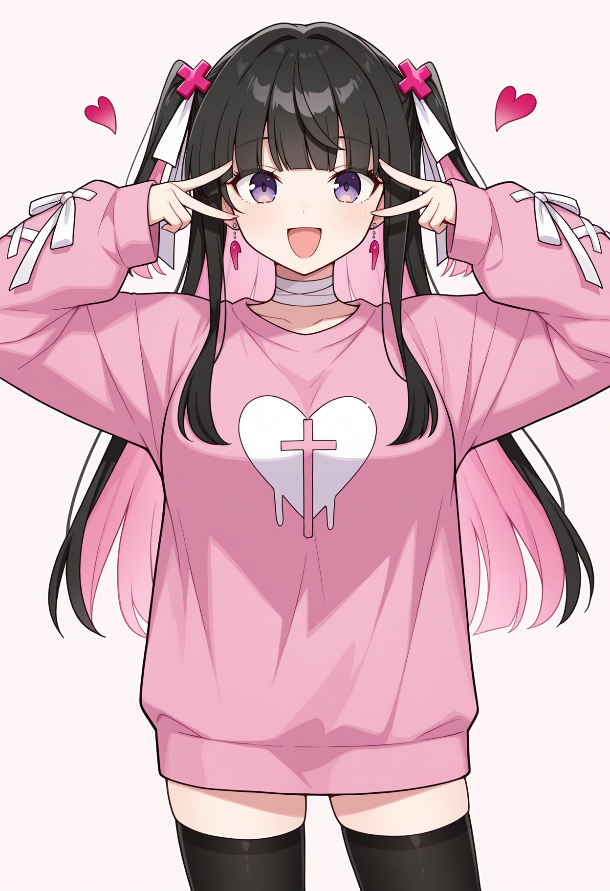 1girl,solo, 紫色眼睛, 两侧高束发, 长发, 黑发, 粉色头发, 彩色内发, 头饰, 发带, 白色丝带, 心形耳环, 破碎的心, 粉色毛衣, 长袖, 十字印花, 十字交叉袖口, 黑色过膝袜,