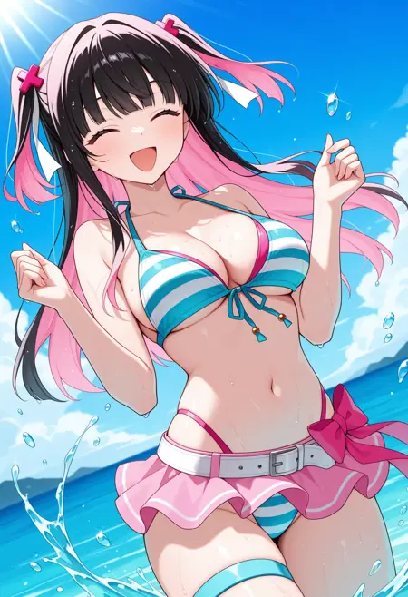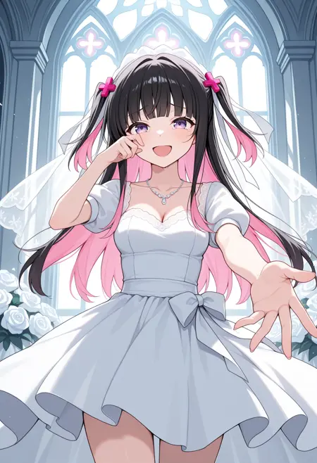 1girl,solo, 紫色眼睛, 两侧高束发, 长发, 黑发, 粉色头发, 彩色内发,