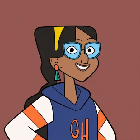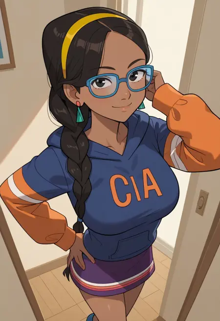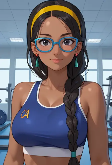 1girl, solo, Sacagawea_CH, 棕色皮肤, 黑色眼睛, 黑色头发, 浓密长发, 低马尾, 黄色发带, 蓝框眼镜, 翡翠色三角耳环