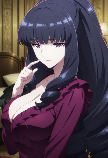 s_mana, 1girl, anime coloring, retro artstyle, solo, long hair, crown braid, black hair, high ponytail, drill hair, blunt bangs, purple eyes, mole under eye, lipstick, sidelocks, mana purple frilled dress, long sleeves, long dress, large breasts, cleavage,