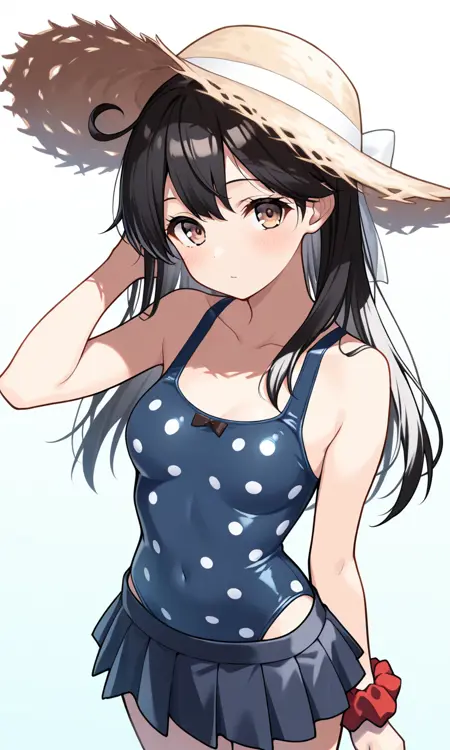 夏の衣装: ushiosummerKC、黒髪、茶色の目、長い髪、アホ毛、プリーツスカート、ドット柄、サンハット、青いワンピース水着、 straw hat、手首用スクンチ、カジュアルワンピース水着、赤いスクンチ、ドット柄水着