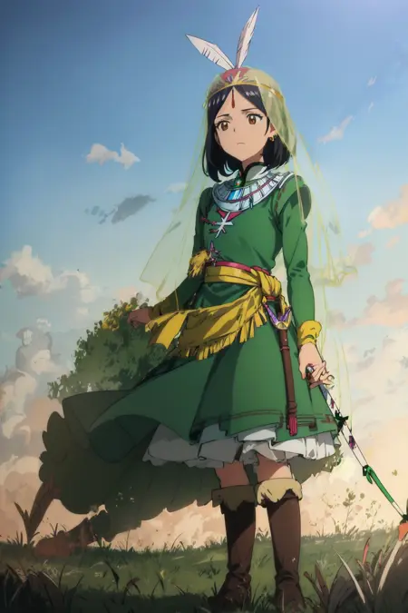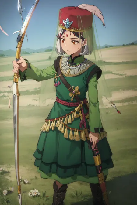 folk: national costume, jewelry, hat, hat feather, emblem, yellow sash, veil, green dress, layered dress, long sleeves, long skirt, boots, fingerless gloves