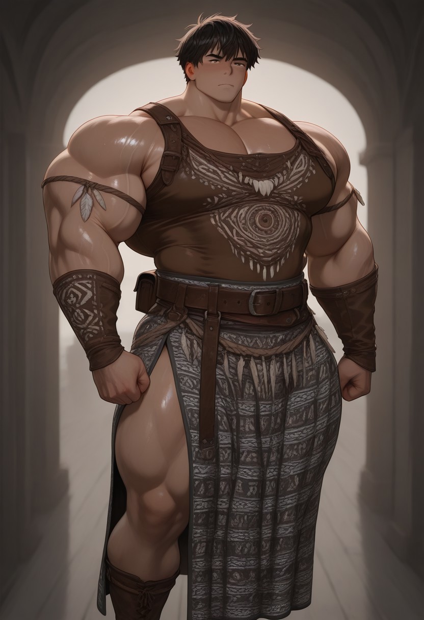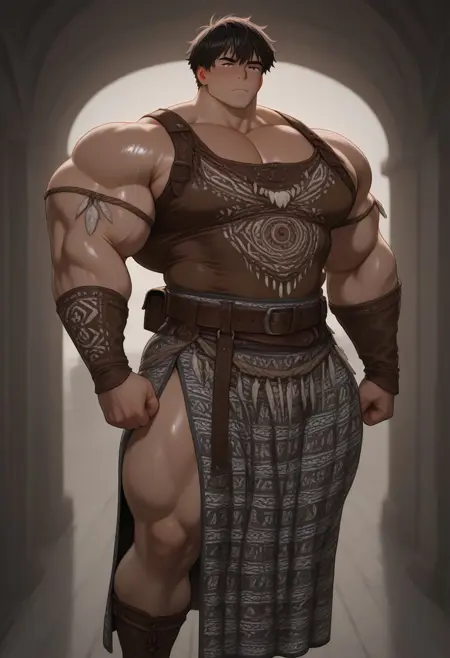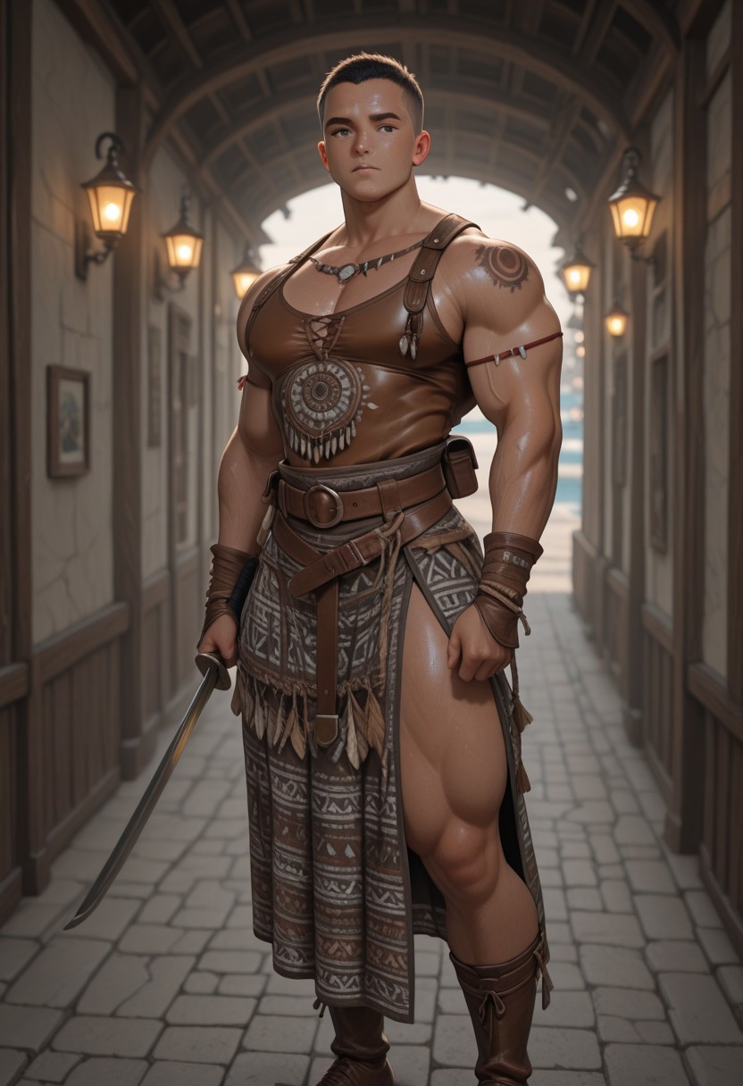 詳細な戦士の衣装を着用し、茶色のレザー製トップス、