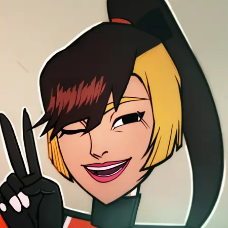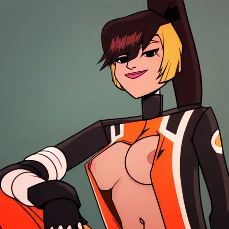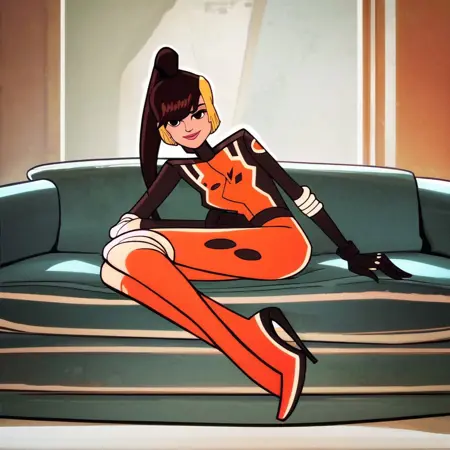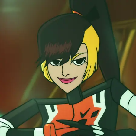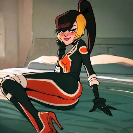 ponytail, lipstick, multicolored hair, orange and black jumpsuit, gloves, heels, racing helmet,