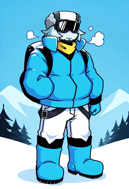 | トレーニングワード | B2GarcelloFNF, 1boy, pale blue skin, thick insulating blue and black snow jacket, yellow scarf, thick white pants, black and blue snow boots, longer pale blue hair, s black snow goggles, black and white snow cap with gray wool on the sides,コピーしました! |
