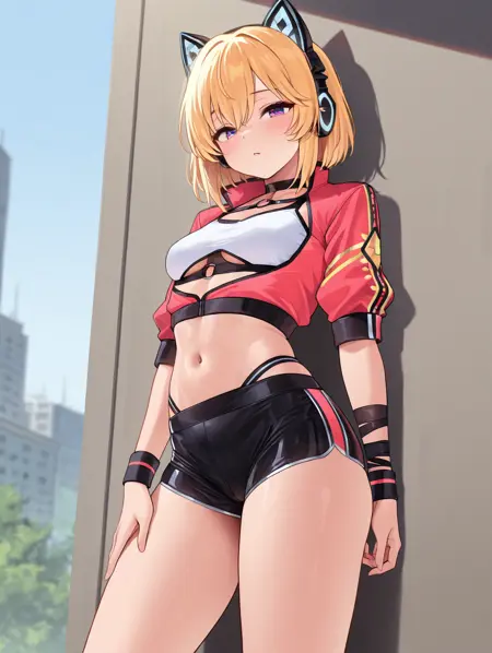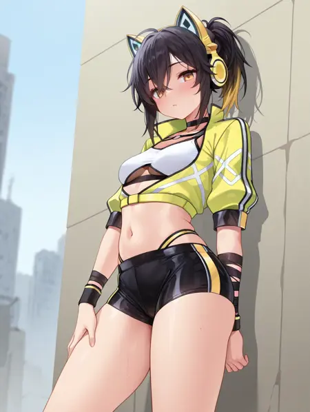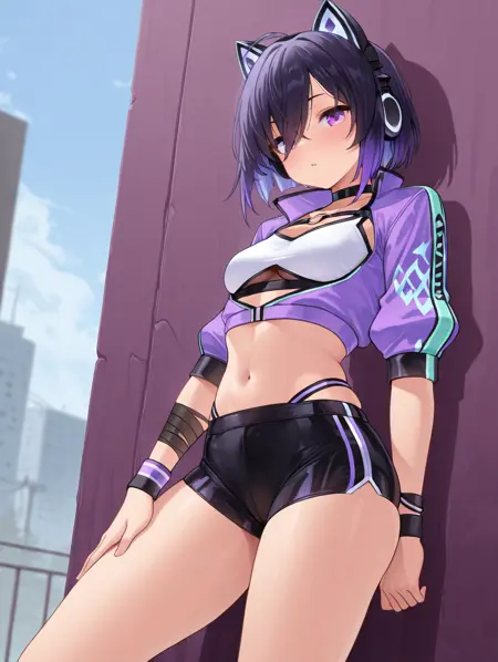 o-ring-sports bra,underboob cutout,black choker, black bandaged arm,cropped jacket, cat ear headphones, wristband,high leg short shorts