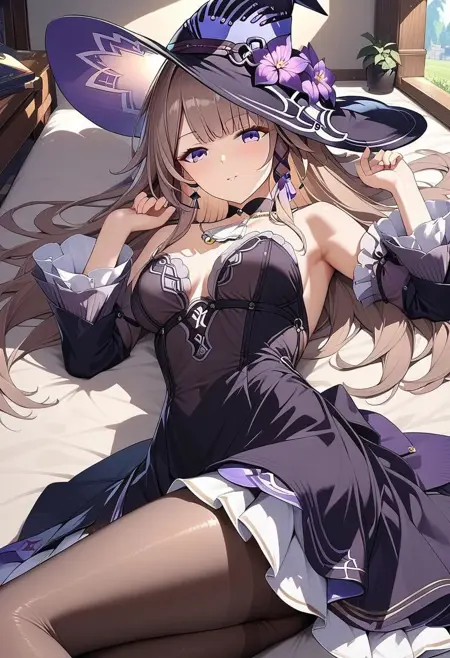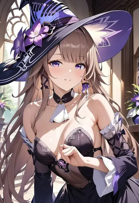 触发词:m_herta_a_xl,棕发,长发,紫眼,女巫帽,帽饰花,黑色项圈,分体袖,赫尔塔裙,黑色裙子,分体袖,无肩带裙子,连裤袜,