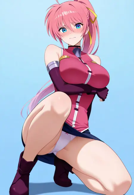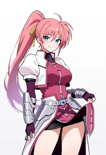 - 全身骑士铠甲/屏障夹克版本:白色短夹克配粉色镶边,金属颈甲,粉色衬衫配披肩,白色腰罩,护臀甲,紫色肘部手套,金属护手,无指手套,紫色腰带,赤腿,金属靴