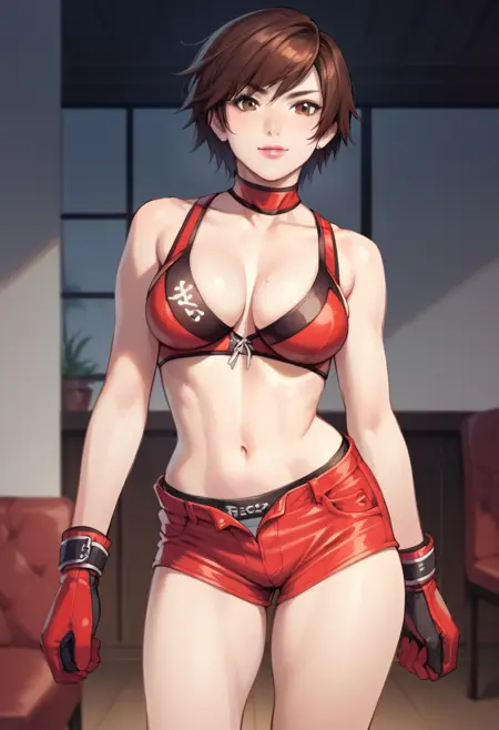 트리거: reiko_hinomoto, 단발, 갈색 머리 여성, 가슴, 젖가슴 노출, 장갑, 배꼽, 초커, 짧은 반바지, 빨간 반바지