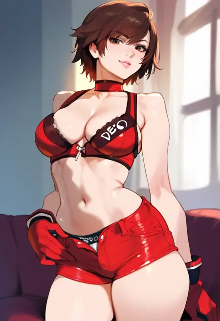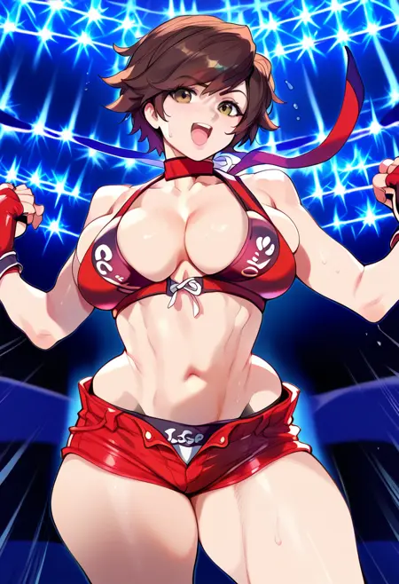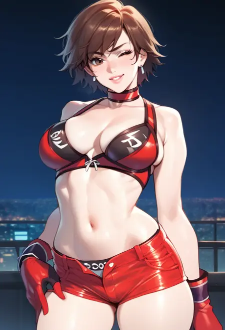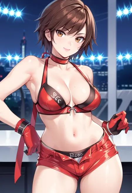 トリガー: reiko_hinomoto、短い髪、茶色の髪の女性、胸、胸元、手袋、へそ、チョーカー、短いショートパンツ、赤いショートパンツ