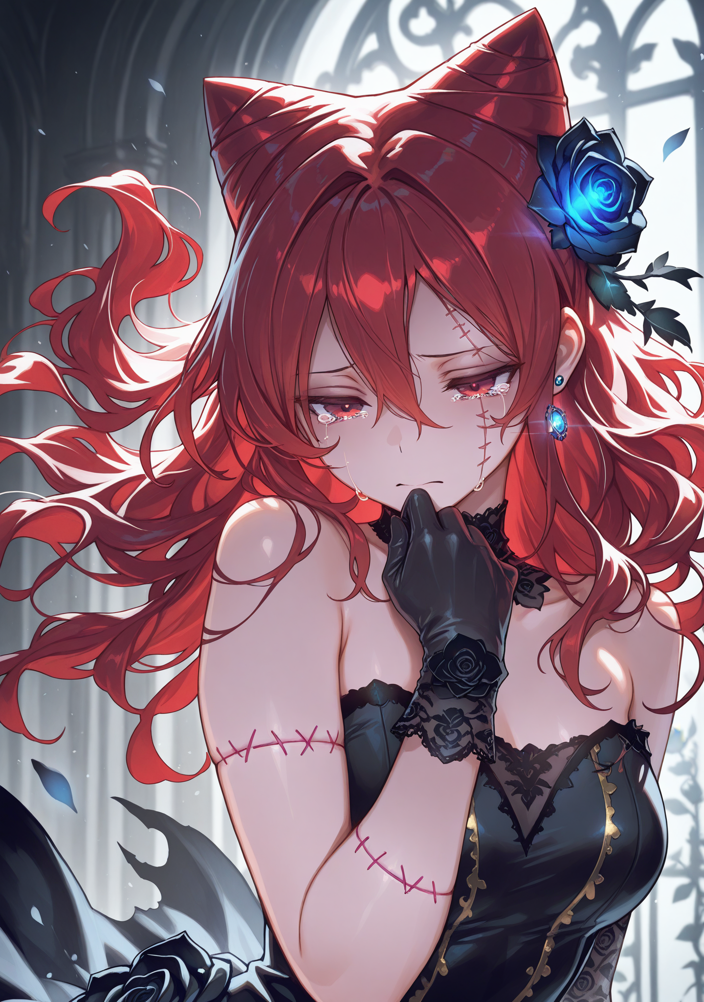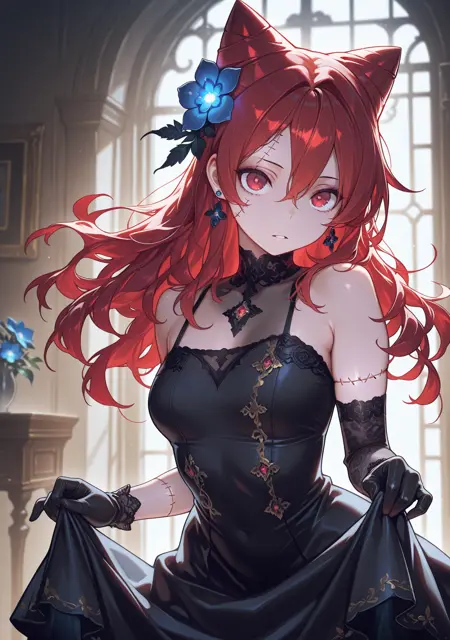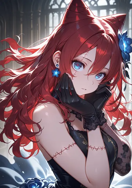 red hair,cone hair bun,hair between eyes,long hair,red eyes,hair ornament,blue flower on,hair flower,jewelry,earrings,stitched face,