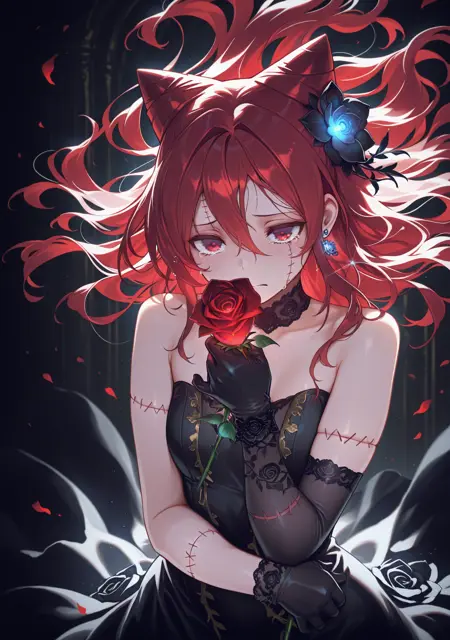 black gloves,black rose on dress,