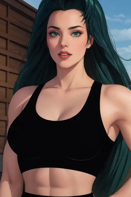 とても長い髪、長い髪、(緑色の肌:1.2)、彩色された肌、胸、緑色の髪、筋肉質、大きな胸、メイク、唇、大きな髪、筋肉質な女性、腹筋、鎖骨、リップスティック、アイシャドウ、へそ、緑色の目、腹筋、背が高い女性、