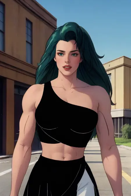 とても長い髪、長い髪、(緑色の肌:1.2)、彩色された肌、胸、緑色の髪、筋肉質、大きな胸、メイク、唇、大きな髪、筋肉質な女性、腹筋、鎖骨、リップスティック、アイシャドウ、へそ、緑色の目、背が高い女性、