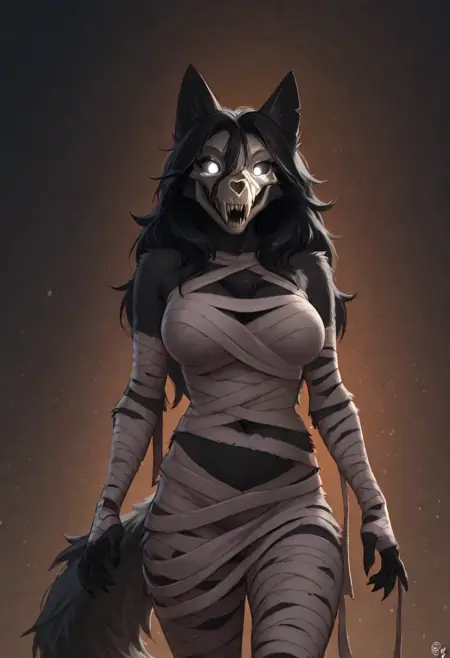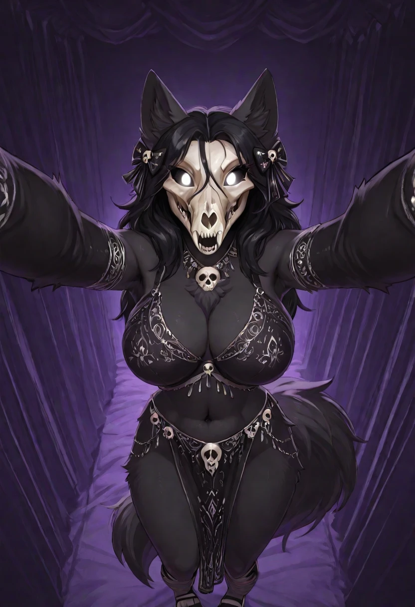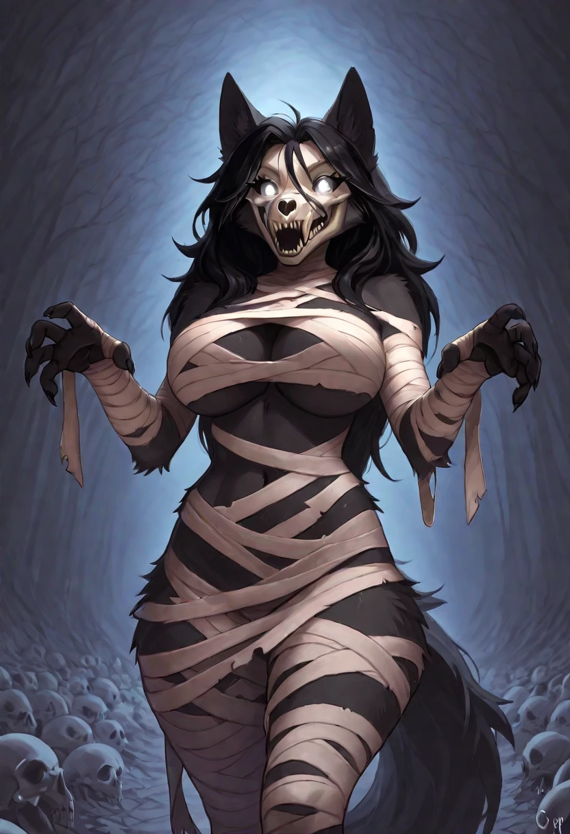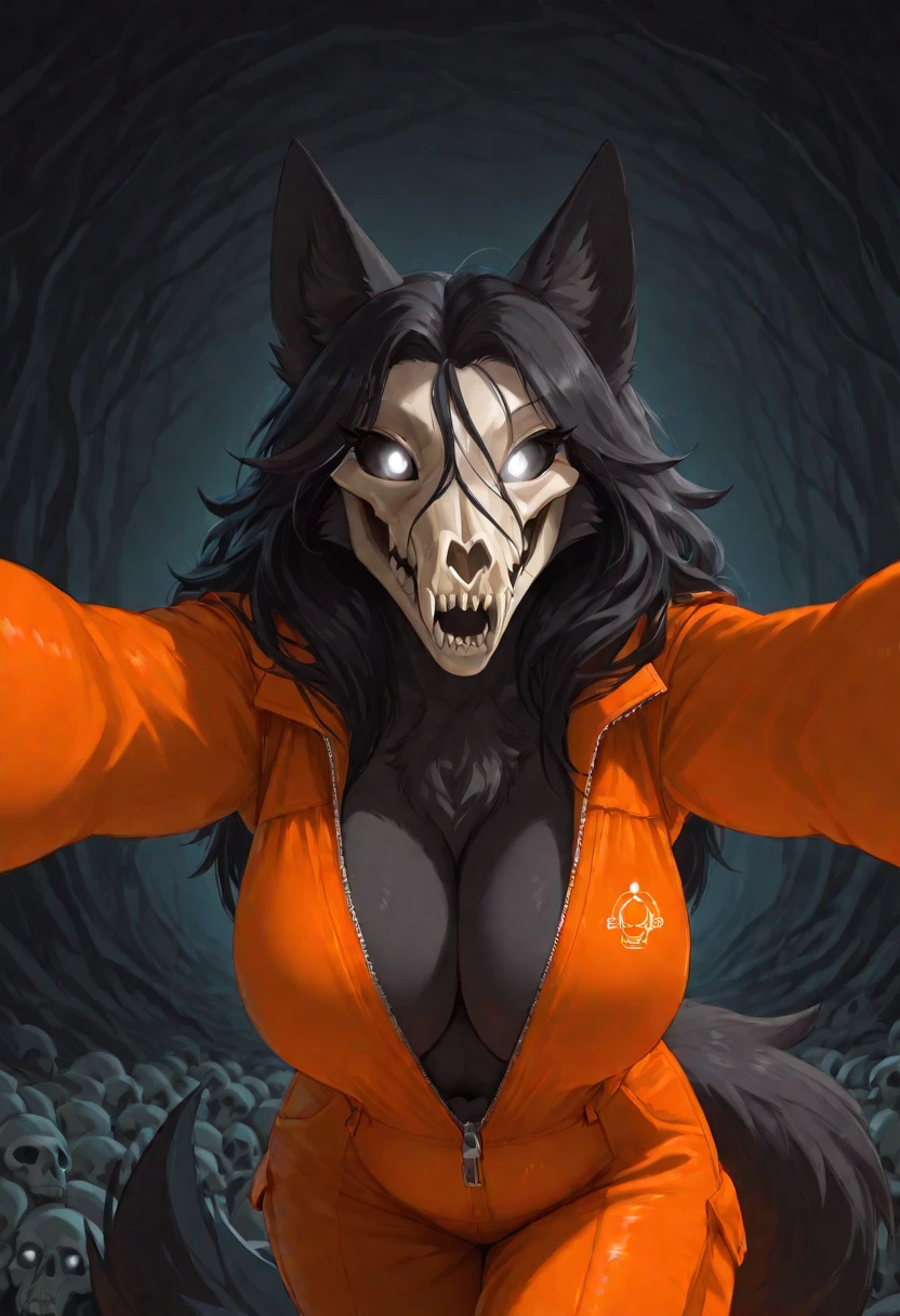 • SCP-1471: 1girl,SCP-1471,long hair, black hair, animal ears, tail,ears,wolf tail,long tail, furry female, skull, wolf girl,fluffy body fur,black sclera white pupils, white eyes,glowing eyes, teeth, fangs, sharp teeth, adult furry female,milf,tall,